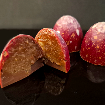Un bombón muy cremoso de chocolate con leche y avellanas tostadas y crujientes.