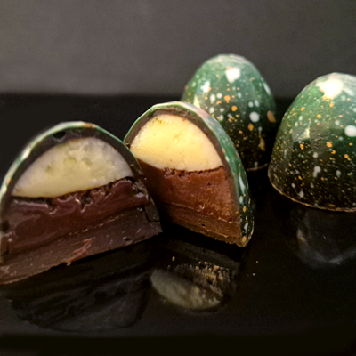 La combinación perfecta para una noche larga, un bombón de menta con chocolate blanco y chocolate negro.